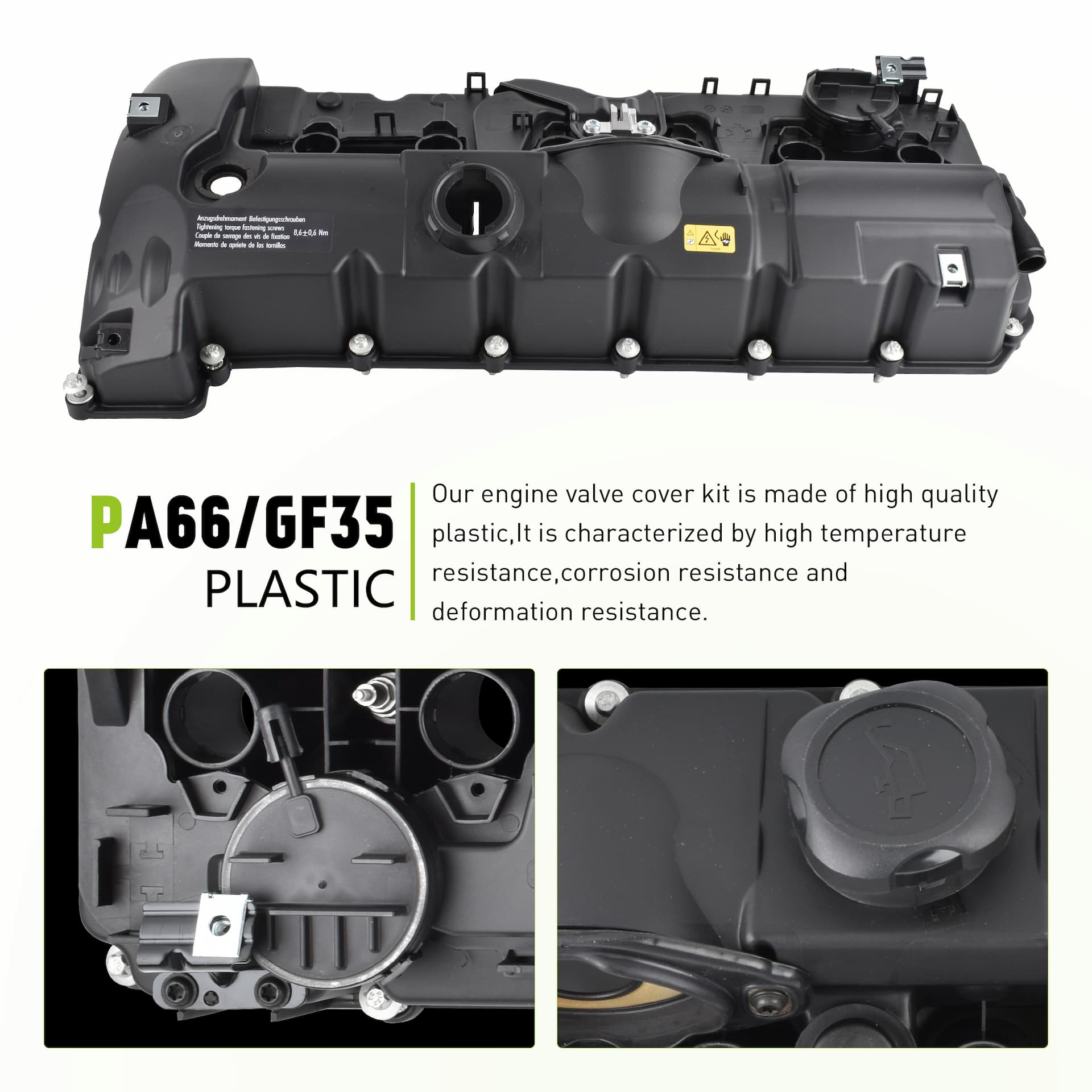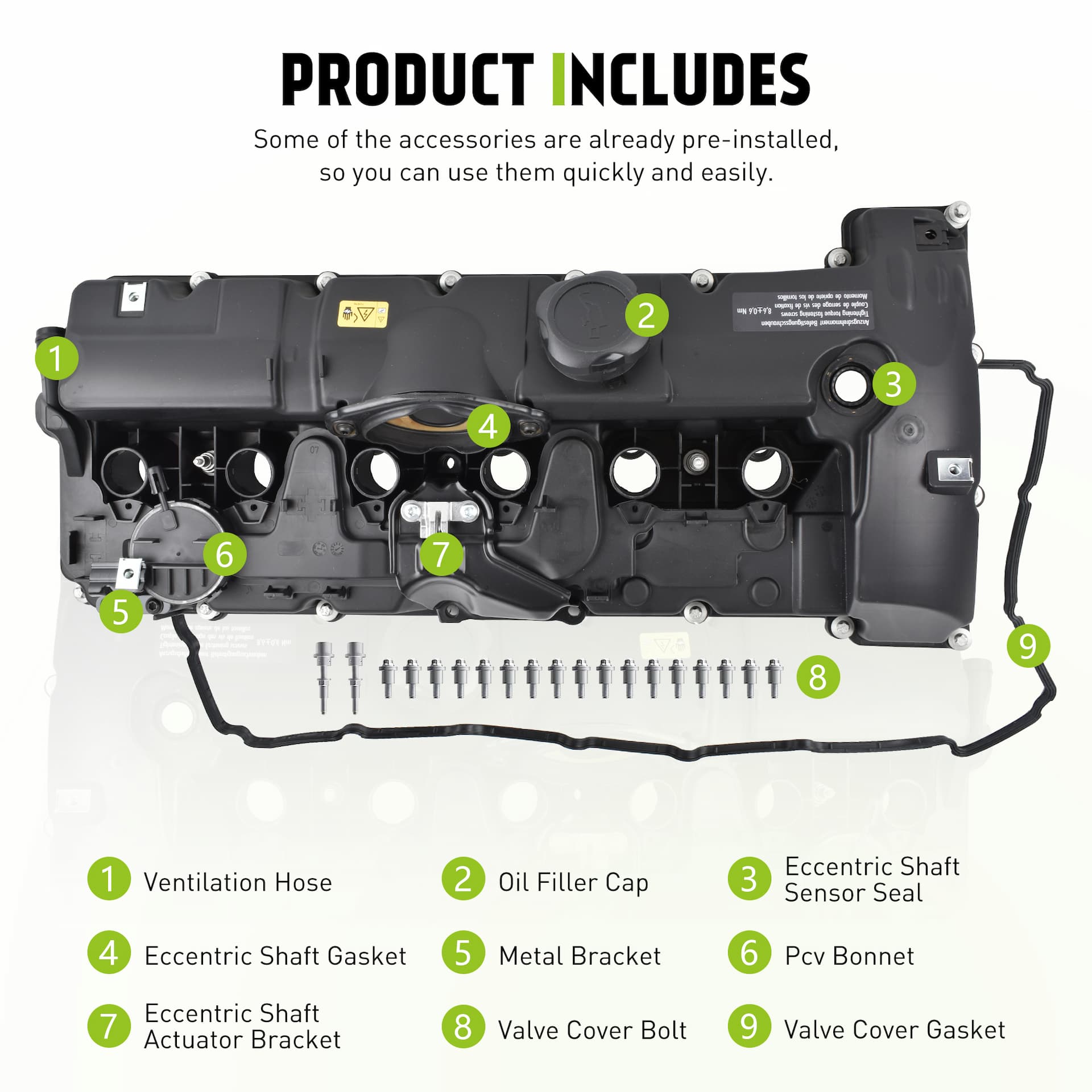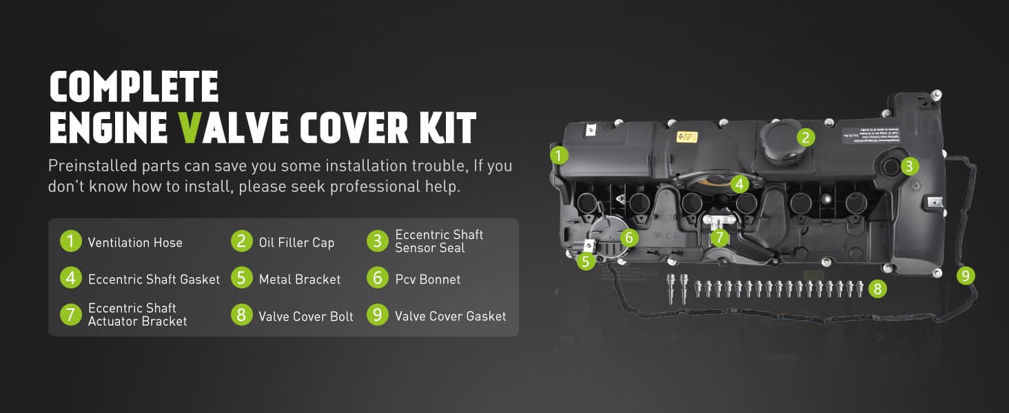 - [COMFORTABLE OPTION] Complete engine valve cover kit with gaskets, bolts and oil cap. Pre-installed parts can save you some installation trouble. Be careful not to over-tighten or loosen the bolts as this may cause deformation of the valve cover. Tighten the bolts properly to ensure proper operation. (If you don't know how to install, please seek professional help)