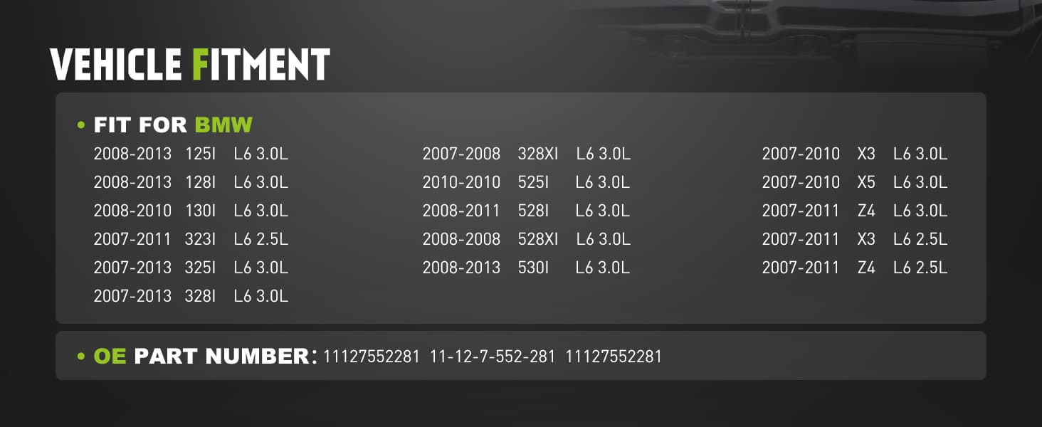 - [VEHICLE FITMENT] Engine valve cover kit Fit for 2008-2013 BMW 125I 128I, 2008-2010 BMW 130I, 2007-2011 BMW 323I, 2007-2013 BMW 325I 328I, 2007-2008 BMW 328XI, 2010 BMW 525I, 2008-2011 BMW 528I, 2008 BMW 528XI, 2008-2013 BMW 530I, 2007-2010 BMW X3 X5, 2007-2011 BMW X3 Z4.