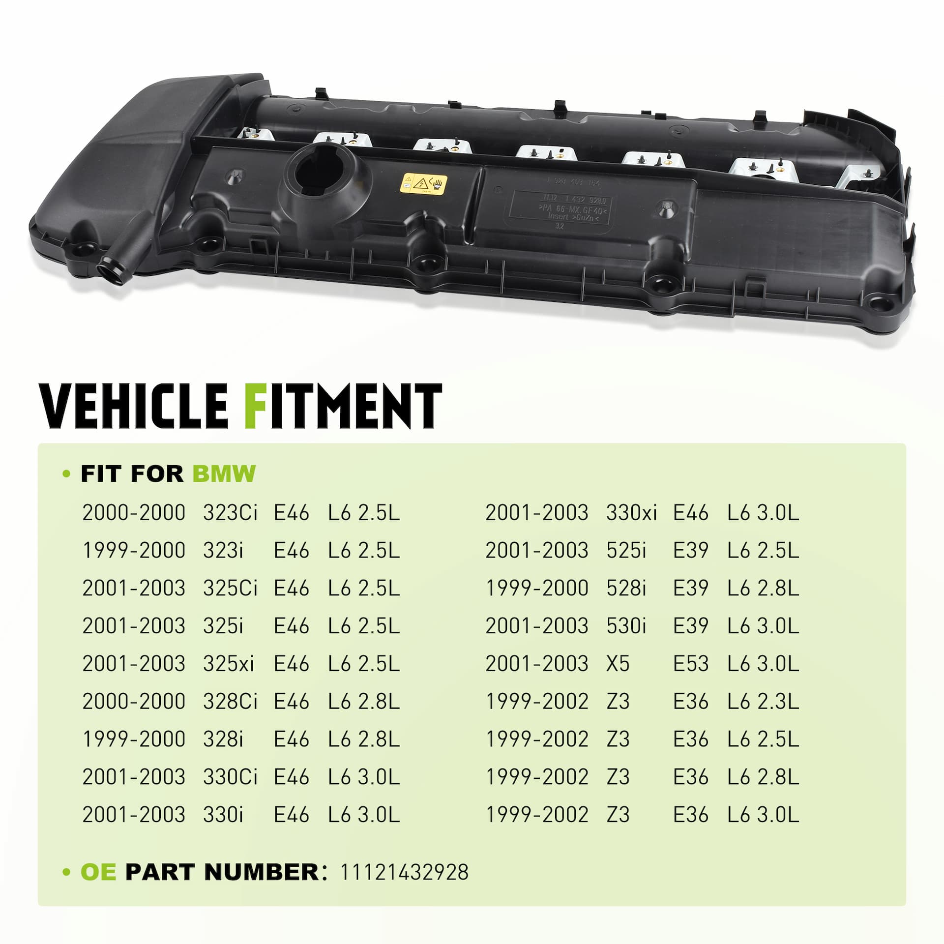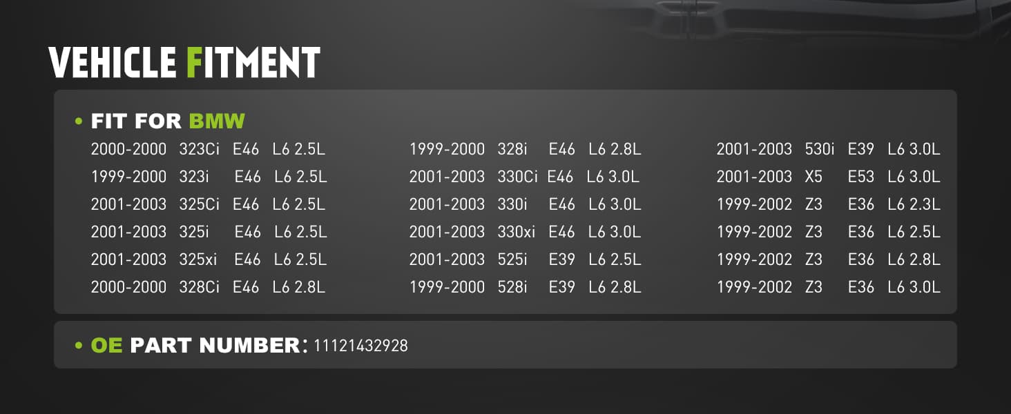 - [VEHICLE FITMENT] Engine Valve Cover Kit Compatible With 2000 Bmw 323ci, 1999-2000 Bmw 323i, 2001-2003 Bmw 325ci, 2001-2003 Bmw 325i, 2001-2003 Bmw 325xi, 2000 Bmw 328ci, 1999-2000 Bmw 328i, 2001-2003 Bmw 330ci, 2001-2003 Bmw 330i, 2001-2003 Bmw 330xi, 2001-2003 Bmw 525i, 1999-2000 Bmw 528i, 2001-2003 Bmw 530i, 2001-2003 Bmw X5, 1999-2002 Bmw Z3, 2.3l 2.5l 2.8l 3.0l Engine.