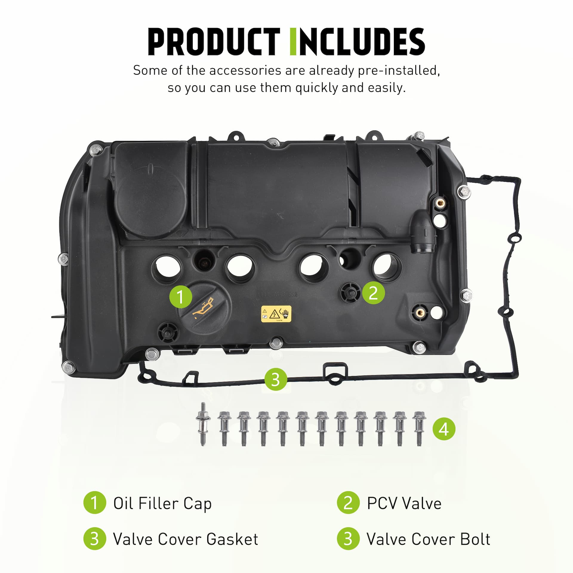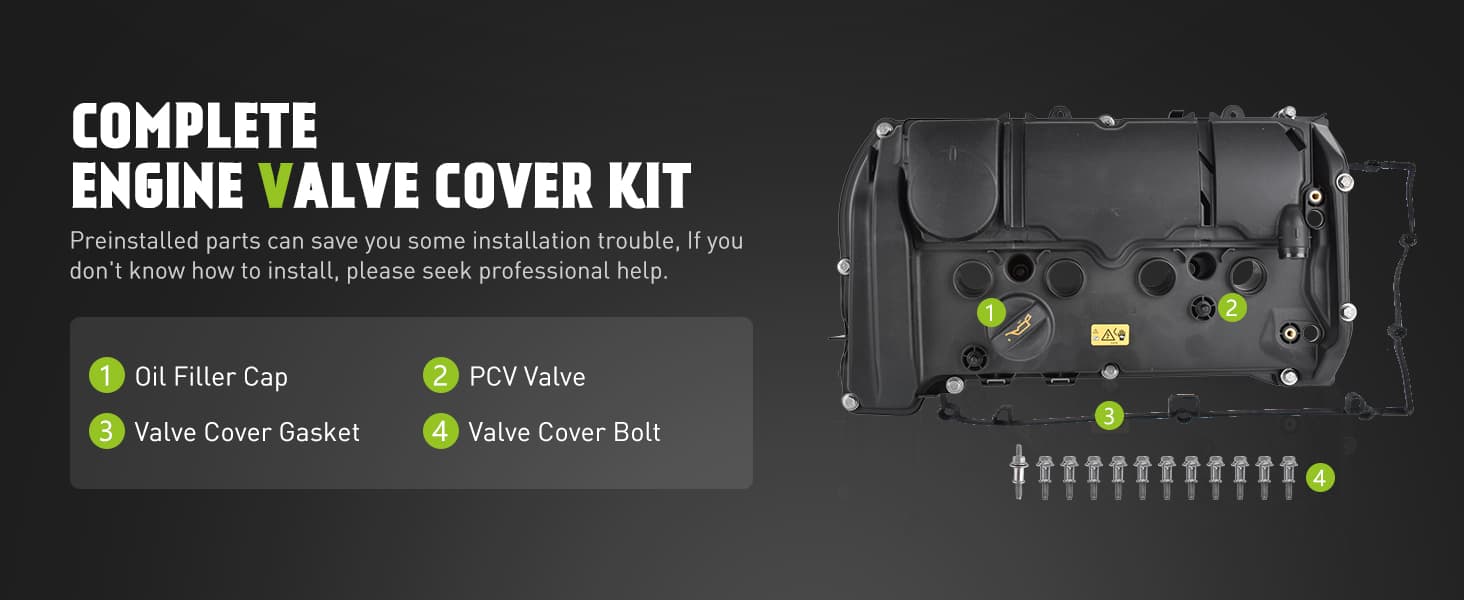 - [COMFORTABLE OPTION] Complete engine valve cover kit with gaskets, bolts and oil cap. Pre-installed parts can save you some installation trouble. Be careful not to over-tighten or loosen the bolts as this may cause deformation of the valve cover. Tighten the bolts properly to ensure proper operation. (If you don't know how to install, please seek professional help)