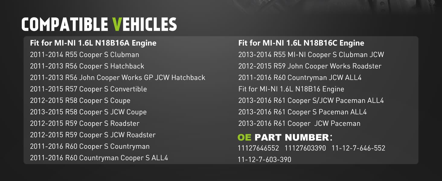 - [VEHICLE FITMENT] Engine Valve Cover Kit Fit For 2011-2014 R55 Mini Cooper S Clubman, 2011-2013 R56 Mini Cooper S Hatchback, 2011-2015 R57 Mini Cooper S Convertible, 2012-2015 R58 Mini Cooper S Coupe, 2012-2015 R59 Mini Cooper S Roadster, 2011-2016 R60 Mini Cooper S Countryman, 2013-2016 R61 Mini Cooper S Paceman L4 1.6l Engine.